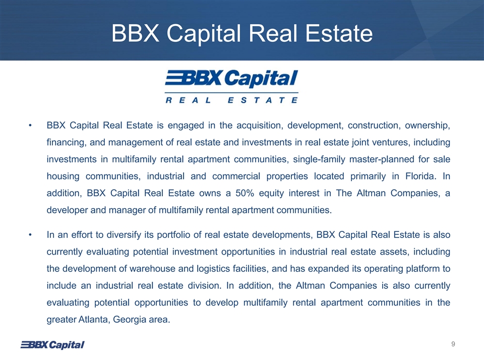 BBX Capital Real Estate • BBX Capital Real Estate is engaged in the acquisition, development, construction, ownership, financing, and management of real estate and investments in real estate joint ventures, including investments in multifamily rental apartment communities, single-family master-planned for sale housing communities, industrial and commercial properties located primarily in Florida. In addition, BBX Capital Real Estate owns a 50% equity interest in The Altman Companies, a developer and manager of multifamily rental apartment communities. • In an effort to diversify its portfolio of real estate developments, BBX Capital Real Estate is also currently evaluating potential investment opportunities in industrial real estate assets, including the development of warehouse and logistics facilities, and has expanded its operating platform to include an industrial real estate division. In addition, the Altman Companies is also currently evaluating potential opportunities to develop multifamily rental apartment communities in the greater Atlanta, Georgia area. 9