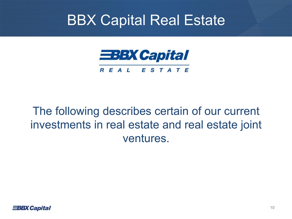 BBX Capital Real Estate The following describes certain of our current investments in real estate and real estate joint ventures. 10