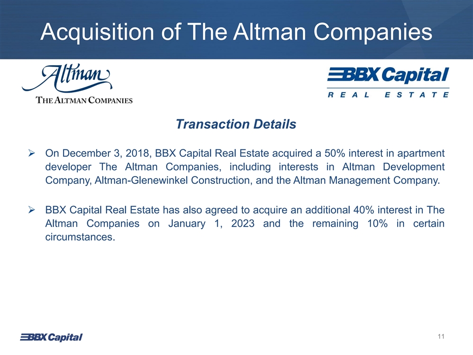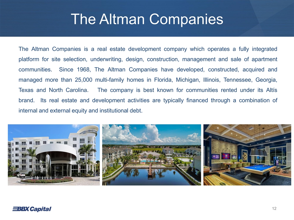 Acquisition of The Altman Companies Transaction Details ➢ On December 3, 2018, BBX Capital Real Estate acquired a 50% interest in apartment developer The Altman Companies, including interests in Altman Development Company, Altman-Glenewinkel Construction, and the Altman Management Company. ➢ BBX Capital Real Estate has also agreed to acquire an additional 40% interest in The Altman Companies on January 1, 2023 and the remaining 10% in certain circumstances. 11