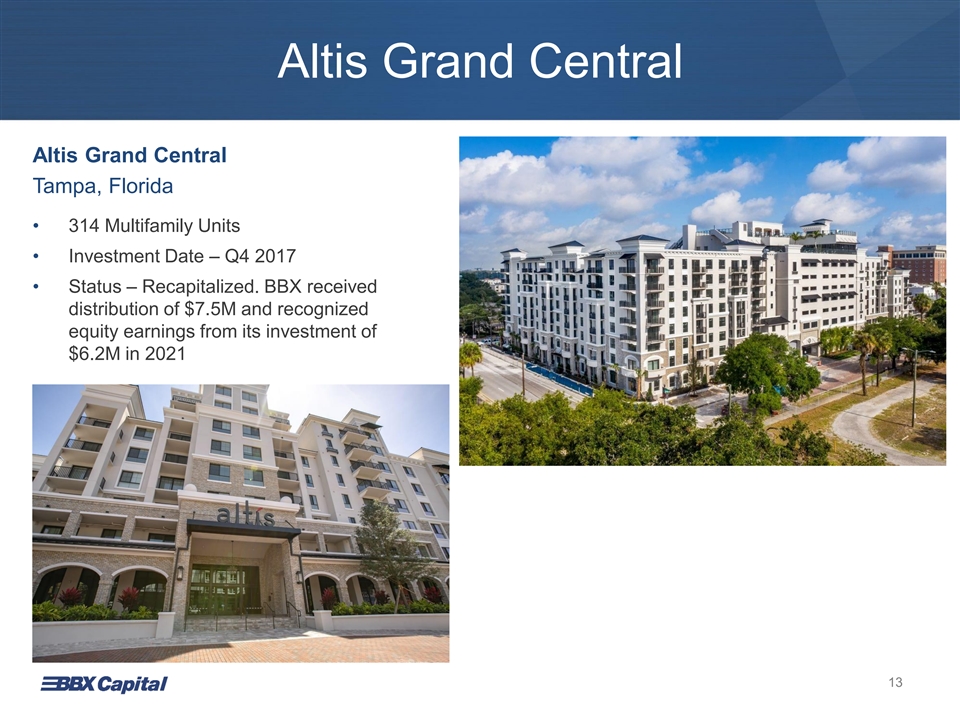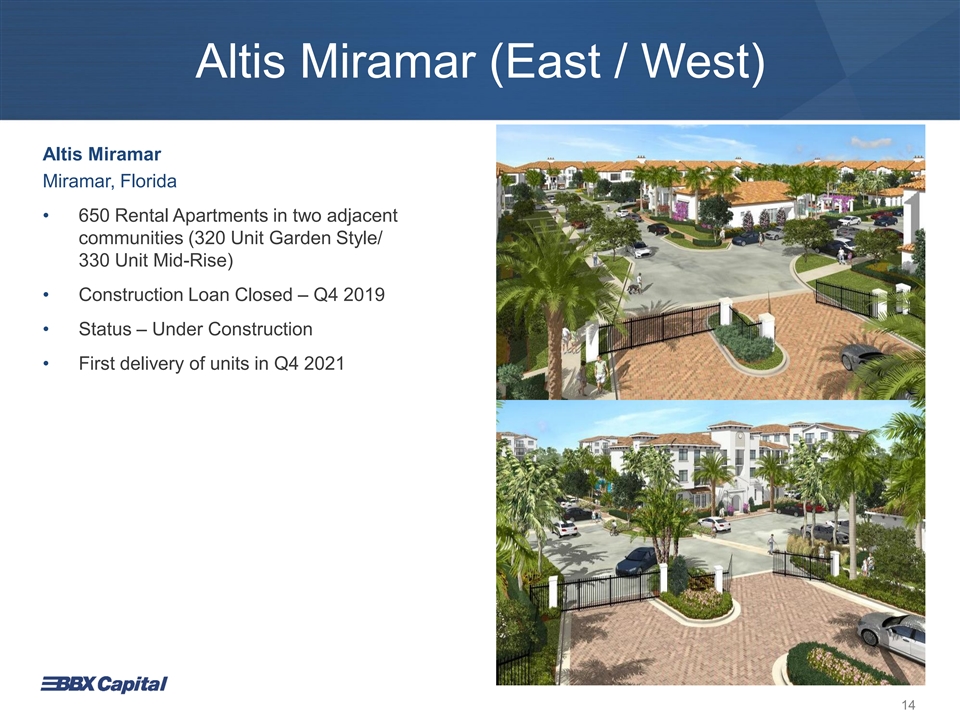 Altis Grand Central Altis Grand Central Tampa, Florida • 314 Multifamily Units • Investment Date – Q4 2017 • Status – Recapitalized. BBX received distribution of $7.5M and recognized equity earnings from its investment of $6.2M in 2021 13