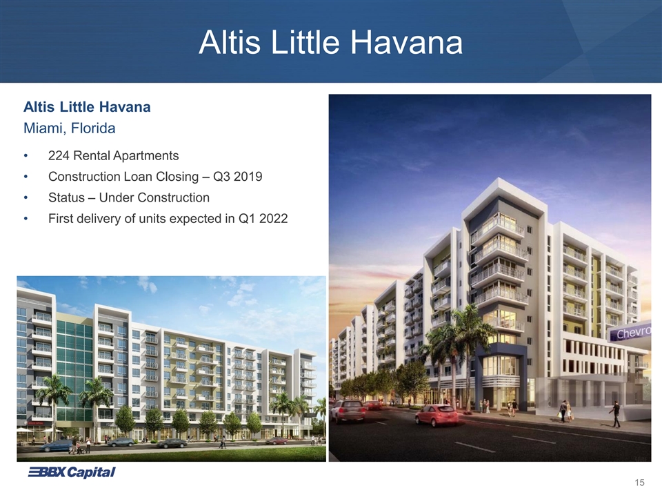 Altis Miramar (East / West) Altis Miramar Miramar, Florida • 650 Rental Apartments in two adjacent communities (320 Unit Garden Style/ 330 Unit Mid-Rise) • Construction Loan Closed – Q4 2019 • Status – Under Construction • First delivery of units in Q4 2021 14