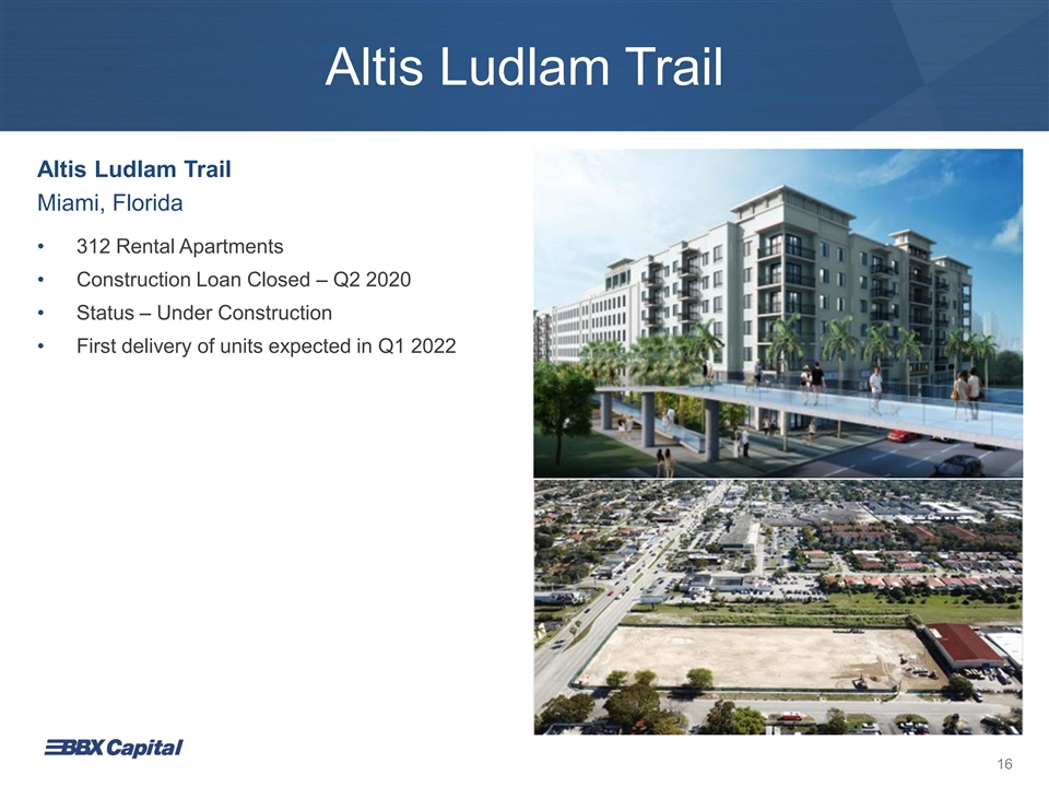 Altis Little Havana Altis Little Havana Miami, Florida • 224 Rental Apartments • Construction Loan Closing – Q3 2019 • Status – Under Construction • First delivery of units expected in Q1 2022 15