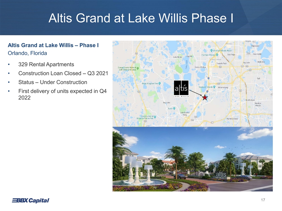 Altis Ludlam Trail Altis Ludlam Trail Miami, Florida • 312 Rental Apartments • Construction Loan Closed – Q2 2020 • Status – Under Construction • First delivery of units expected in Q1 2022 16