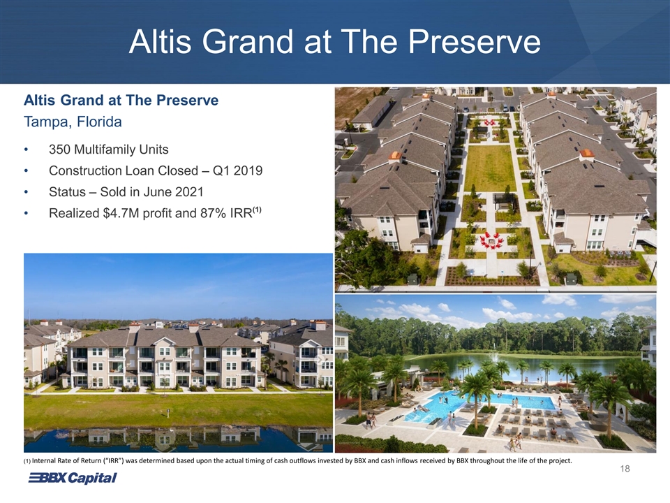 Altis Grand at Lake Willis Phase I Altis Grand at Lake Willis – Phase I Orlando, Florida • 329 Rental Apartments • Construction Loan Closed – Q3 2021 • Status – Under Construction • First delivery of units expected in Q4 2022 17