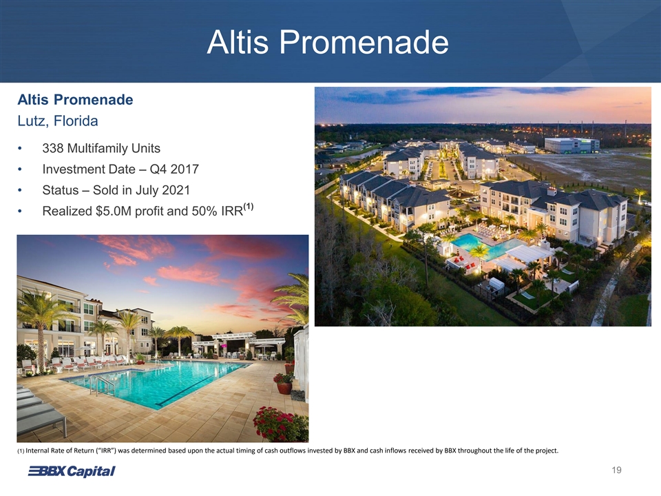 Altis Grand at The Preserve Altis Grand at The Preserve Tampa, Florida • 350 Multifamily Units • Construction Loan Closed – Q1 2019 • Status – Sold in June 2021 (1) • Realized $4.7M profit and 87% IRR (1) Internal Rate of Return (“IRR”) was determined based upon the actual timing of cash outflows invested by BBX and cash inflows received by BBX throughout the life of the project. 18