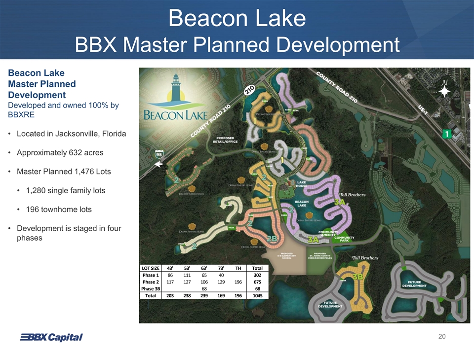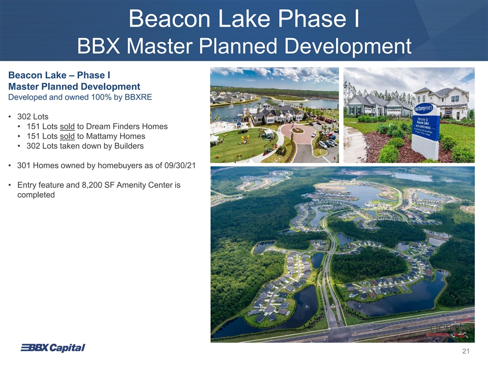Beacon Lake BBX Master Planned Development Beacon Lake Master Planned Development Developed and owned 100% by BBXRE • Located in Jacksonville, Florida • Approximately 632 acres • Master Planned 1,476 Lots • 1,280 single family lots • 196 townhome lots • Development is staged in four phases LOT SIZE 43' 53' 63' 73' TH Total Phase 1 86 111 65 40 302 Phase 2 117 127 106 129 196 675 Phase 3B 68 68 Total 203 238 239 169 196 1045 20