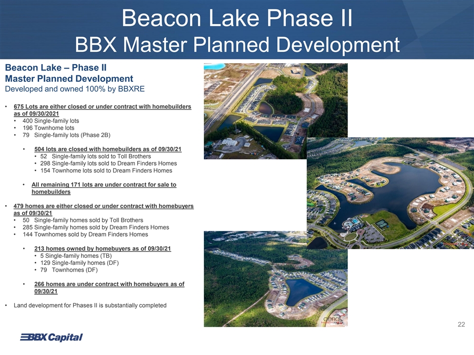 Beacon Lake Phase I BBX Master Planned Development Beacon Lake – Phase I Master Planned Development Developed and owned 100% by BBXRE • 302 Lots • 151 Lots sold to Dream Finders Homes • 151 Lots sold to Mattamy Homes • 302 Lots taken down by Builders • 301 Homes owned by homebuyers as of 09/30/21 • Entry feature and 8,200 SF Amenity Center is completed 21