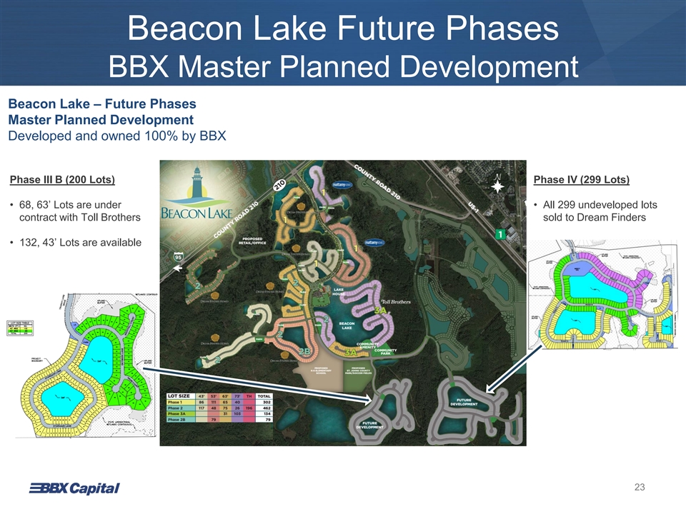 Beacon Lake Phase II BBX Master Planned Development Beacon Lake – Phase II Master Planned Development Developed and owned 100% by BBXRE • 675 Lots are either closed or under contract with homebuilders as of 09/30/2021 • 400 Single-family lots • 196 Townhome lots • 79 Single-family lots (Phase 2B) • 504 lots are closed with homebuilders as of 09/30/21 • 52 Single-family lots sold to Toll Brothers • 298 Single-family lots sold to Dream Finders Homes • 154 Townhome lots sold to Dream Finders Homes • All remaining 171 lots are under contract for sale to homebuilders • 479 homes are either closed or under contract with homebuyers as of 09/30/21 • 50 Single-family homes sold by Toll Brothers • 285 Single-family homes sold by Dream Finders Homes • 144 Townhomes sold by Dream Finders Homes • 213 homes owned by homebuyers as of 09/30/21 • 5 Single-family homes (TB) • 129 Single-family homes (DF) • 79 Townhomes (DF) • 266 homes are under contract with homebuyers as of 09/30/21 • Land development for Phases II is substantially completed 22
