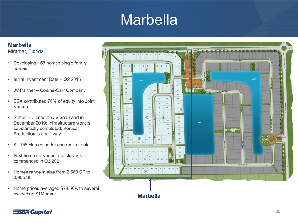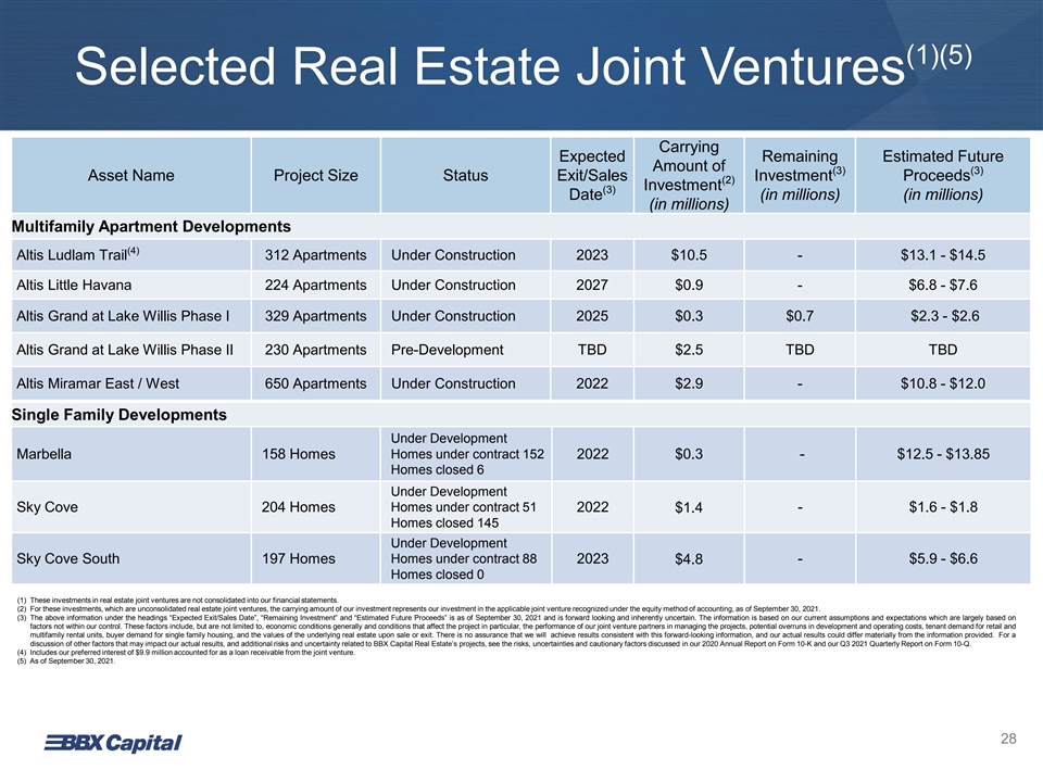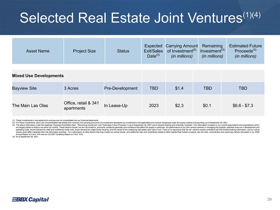 (1)(5) Selected Real Estate Joint Ventures Carrying Expected Remaining Estimated Future Amount of (3) (3) Asset Name Project Size Status Exit/Sales Investment Proceeds (2) Investment (3) Date (in millions) (in millions) (in millions) Multifamily Apartment Developments (4) Altis Ludlam Trail 312 Apartments Under Construction 2023 $10.5 - $13.1 - $14.5 Altis Little Havana 224 Apartments Under Construction 2027 $0.9 - $6.8 - $7.6 Altis Grand at Lake Willis Phase I 329 Apartments Under Construction 2025 $0.3 $0.7 $2.3 - $2.6 Altis Grand at Lake Willis Phase II 230 Apartments Pre-Development TBD $2.5 TBD TBD Altis Miramar East / West 650 Apartments Under Construction 2022 $2.9 - $10.8 - $12.0 Single Family Developments Under Development Marbella 158 Homes Homes under contract 152 2022 $0.3 - $12.5 - $13.85 Homes closed 6 Under Development Homes under contract 51 Sky Cove 204 Homes 2022 $1.4 - $1.6 - $1.8 Homes closed 145 Under Development Sky Cove South 197 Homes Homes under contract 88 2023 - $5.9 - $6.6 $4.8 Homes closed 0 (1) These investments in real estate joint ventures are not consolidated into our financial statements. (2) For these investments, which are unconsolidated real estate joint ventures, the carrying amount of our investment represents our investment in the applicable joint venture recognized under the equity method of accounting, as of September 30, 2021. (3) The above information under the headings “Expected Exit/Sales Date”, “Remaining Investment” and “Estimated Future Proceeds” is as of September 30, 2021 and is forward looking and inherently uncertain. The information is based on our current assumptions and expectations which are largely based on factors not within our control. These factors include, but are not limited to, economic conditions generally and conditions that affect the project in particular, the performance of our joint venture partners in managing the projects, potential overruns in development and operating costs, tenant demand for retail and multifamily rental units, buyer demand for single family housing, and the values of the underlying real estate upon sale or exit. There is no assurance that we will achieve results consistent with this forward-looking information, and our actual results could differ materially from the information provided. For a discussion of other factors that may impact our actual results, and additional risks and uncertainty related to BBX Capital Real Estate’s projects, see the risks, uncertainties and cautionary factors discussed in our 2020 Annual Report on Form 10-K and our Q3 2021 Quarterly Report on Form 10-Q. (4) Includes our preferred interest of $9.9 million accounted for as a loan receivable from the joint venture. (5) As of September 30, 2021. 28