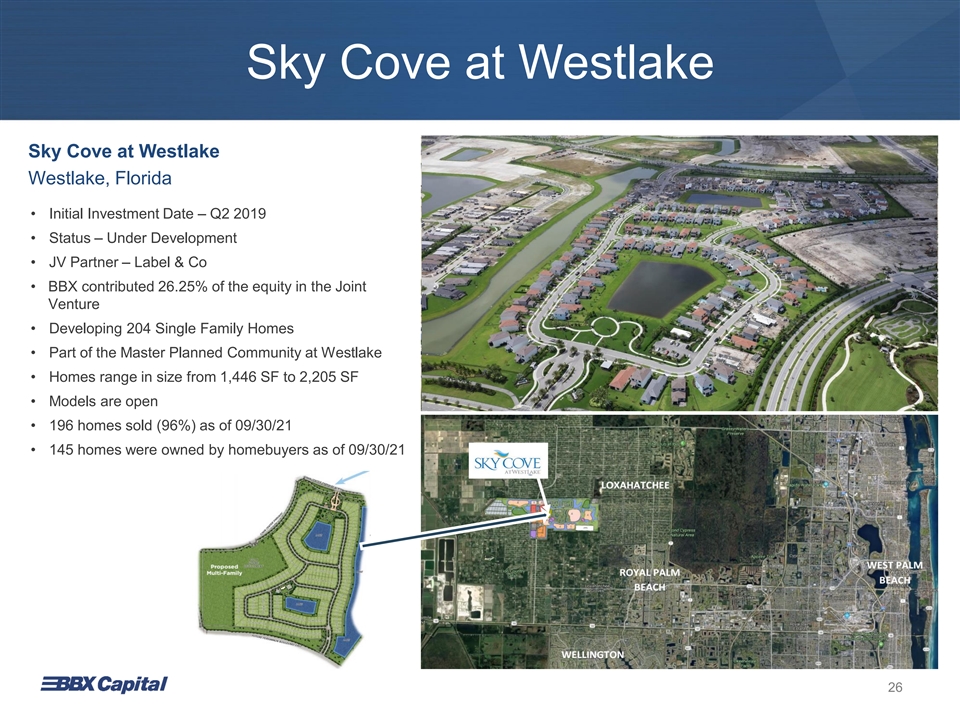 Marbella Marbella Miramar, Florida • Developing 158 homes single family homes • Initial Investment Date – Q2 2015 • JV Partner – Codina-Carr Company • BBX contributed 70% of equity into Joint Venture • Status – Closed on JV and Land in December 2019; Infrastructure work is substantially completed; Vertical Production is underway • All 158 Homes under contract for sale • First home deliveries and closings commenced in Q3 2021 • Homes range in size from 2,588 SF to 3,985 SF • Home prices averaged $785K with several exceeding $1M mark Marbella 25