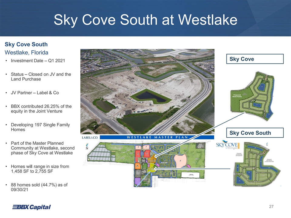 Sky Cove at Westlake Sky Cove at Westlake Westlake, Florida • Initial Investment Date – Q2 2019 • Status – Under Development • JV Partner – Label & Co • BBX contributed 26.25% of the equity in the Joint Venture • Developing 204 Single Family Homes • Part of the Master Planned Community at Westlake • Homes range in size from 1,446 SF to 2,205 SF • Models are open • 196 homes sold (96%) as of 09/30/21 • 145 homes were owned by homebuyers as of 09/30/21 26
