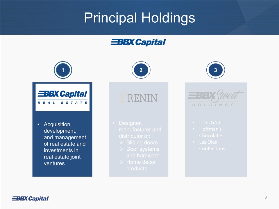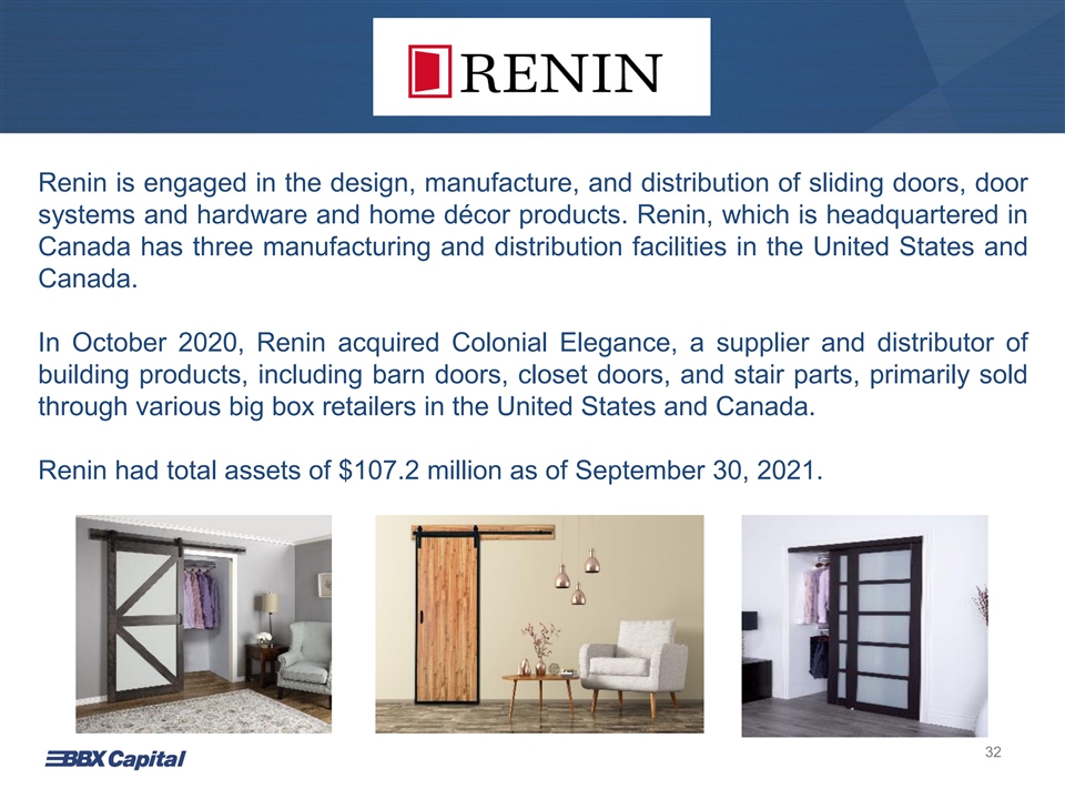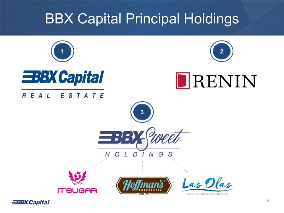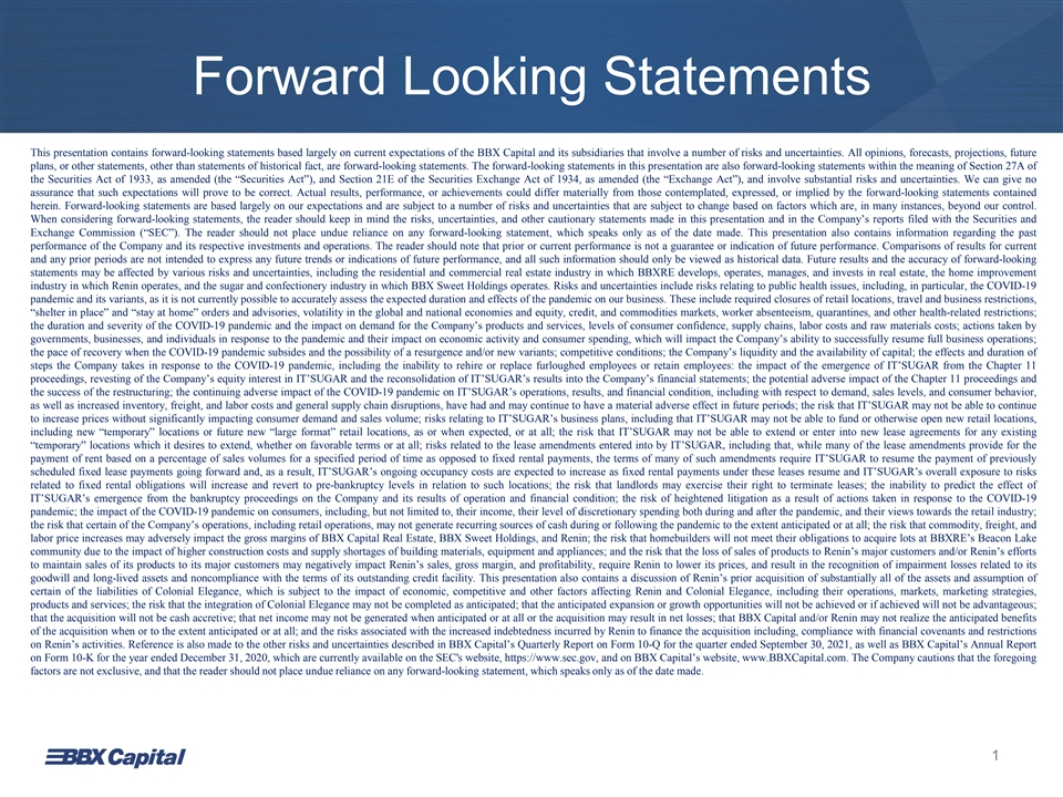 Forward Looking Statements This presentation contains forward-looking statements based largely on current expectations of the BBX Capital and its subsidiaries that involve a number of risks and uncertainties. All opinions, forecasts, projections, future plans, or other statements, other thanstatements of historical fact, are forward-lookingstatements. The forward-lookingstatements in thispresentation are also forward-lookingstatements within the meaning ofSection 27Aof the Securities Act of 1933, as amended (the“SecuritiesAct”), and Section 21E of the Securities Exchange Act of 1934, as amended (the“ExchangeAct”), and involve substantial risks and uncertainties. We can give no assurance that such expectations will prove to be correct. Actual results, performance, or achievements could differ materially from those contemplated, expressed, or implied by the forward-looking statements contained herein. Forward-looking statements are based largely on our expectations and are subject to a number of risks and uncertainties that are subject to change based on factors which are, in many instances, beyond our control. When considering forward-looking statements, the reader should keep in mind the risks, uncertainties, and other cautionary statements made in this presentation and in theCompany’s reports filed with the Securities and Exchange Commission(“SEC”). The reader should not place undue reliance on any forward-looking statement, which speaks only as of the date made. This presentation also contains information regarding the past performance of the Company and its respective investments and operations. The reader should note that prior or current performance is not a guarantee or indication of future performance. Comparisons of results for current and any prior periods are not intended to express any future trends or indications of future performance, and all such information should only be viewed as historical data. Future results and the accuracy of forward-looking statements may be affected by various risks and uncertainties, including the residential and commercial real estate industry in which BBXRE develops, operates, manages, and invests in real estate, the home improvement industryin which Renin operates, and the sugar and confectioneryindustryin which BBX Sweet Holdings operates. Risks and uncertainties include risks relating to public health issues, including, in particular, the COVID-19 pandemicand its variants, as itisnot currentlypossible toaccuratelyassess theexpectedduration and effects ofthe pandemic on ourbusiness. These include required closures ofretaillocations,travelandbusinessrestrictions, “shelter inplace” and“stay athome” orders and advisories, volatility in the global and national economies and equity, credit, and commodities markets, worker absenteeism, quarantines, and other health-related restrictions; the duration and severity of the COVID-19 pandemic and the impact on demand for theCompany’s products and services, levels of consumer confidence, supply chains, labor costs and raw materials costs; actions taken by governments, businesses, and individuals in response to the pandemic and their impact on economic activity and consumer spending, which will impact theCompany’s ability to successfully resume full business operations; the pace of recovery when the COVID-19 pandemic subsides and the possibility of a resurgence and/or new variants; competitive conditions; theCompany’s liquidity and the availability of capital; the effects and duration of steps the Company takes in response to the COVID-19 pandemic, including the inability to rehire or replace furloughed employees or retain employees: the impact of the emergence ofIT’SUGAR from the Chapter 11 proceedings, revesting of theCompany’s equity interest inIT’SUGAR and the reconsolidation ofIT’SUGAR’s results into theCompany’s financial statements; the potential adverse impact of the Chapter 11 proceedings and the success of the restructuring; the continuing adverse impact of the COVID-19 pandemic onIT’SUGAR’s operations, results, and financial condition, including with respect to demand, sales levels, and consumer behavior, as well as increased inventory, freight, and labor costs and general supplychain disruptions, have had and maycontinue to have a material adverse effect in future periods; the risk thatIT’SUGAR maynot be able to continue to increase prices without significantly impacting consumer demand and sales volume; risks relating toIT’SUGAR’s business plans, including thatIT’SUGAR may not be able to fund or otherwise open new retail locations, including new“temporary” locations or future new“largeformat” retail locations, as or when expected, or at all; the risk thatIT’SUGAR may not be able to extend or enter into new lease agreements for any existing “temporary” locations which it desires to extend, whether on favorable terms or at all; risks related to the lease amendments entered into byIT’SUGAR, including that, while many of the lease amendments provide for the payment of rent based on a percentage of sales volumes for a specified period of time as opposed to fixed rental payments, the terms of many of such amendments requireIT’SUGAR to resume the payment of previously scheduled fixed lease payments going forward and, as a result,IT’SUGAR’s ongoing occupancy costs are expected to increase as fixed rental payments under these leases resume andIT’SUGAR’s overall exposure to risks related to fixed rental obligations will increase and revert to pre-bankruptcy levels in relation to such locations; the risk that landlords may exercise their right to terminate leases; the inability to predict the effect of IT’SUGAR’s emergence from the bankruptcy proceedings on the Company and its results of operation and financial condition; the risk of heightened litigation as a result of actions taken in response to the COVID-19 pandemic; th