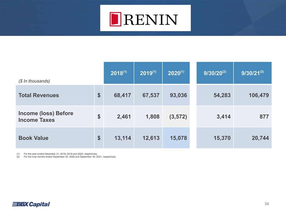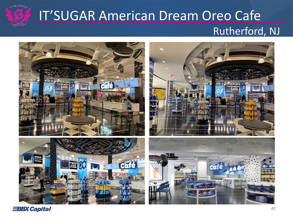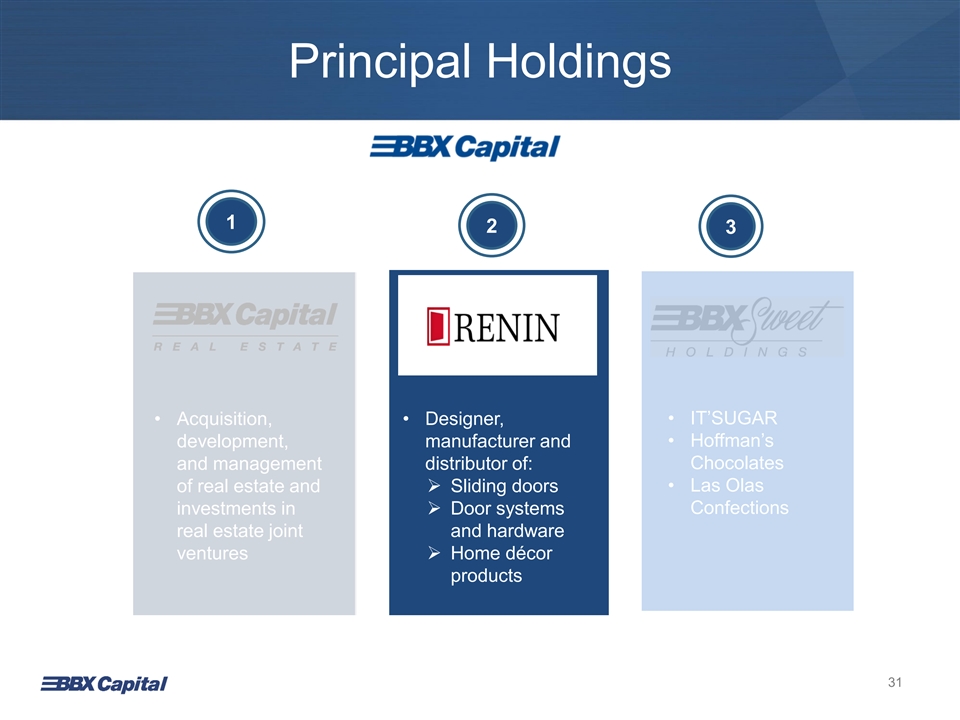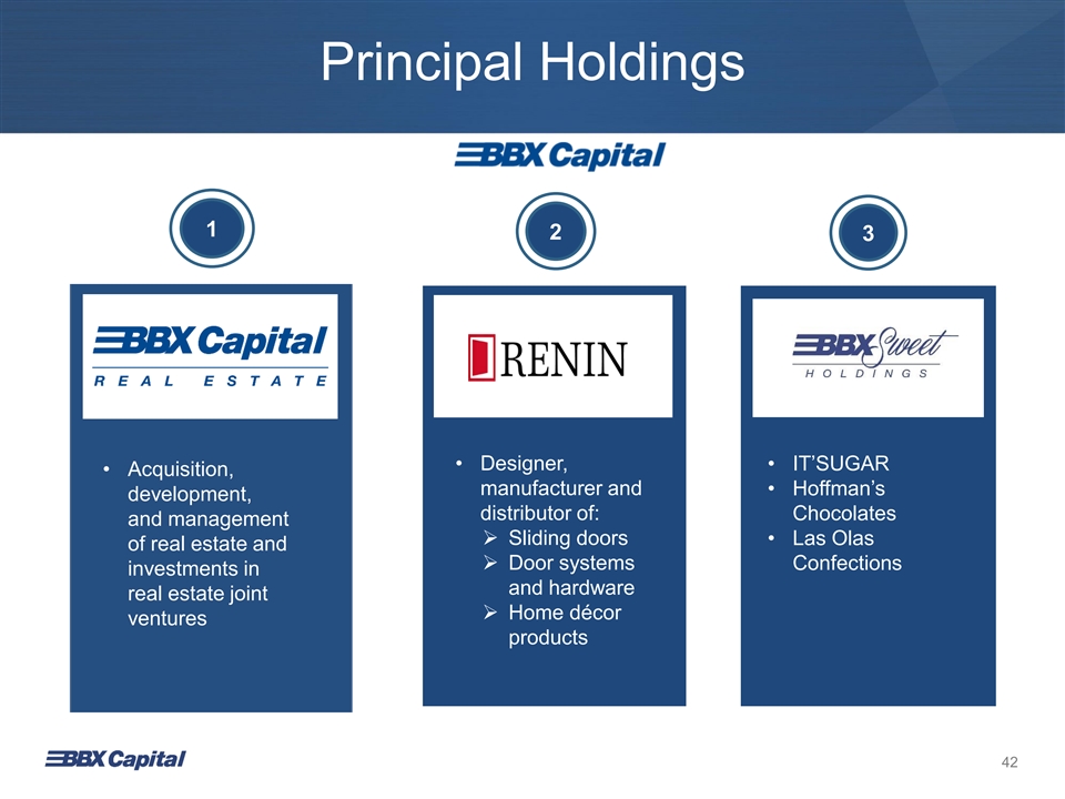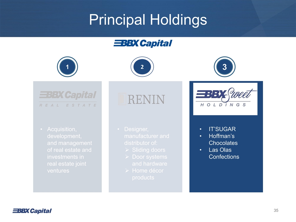 Forward Looking Statements This presentation contains forward-looking statements based largely on current expectations of the BBX Capital and its subsidiaries that involve a number of risks and uncertainties. All opinions, forecasts, projections, future plans, or other statements, other thanstatements of historical fact, are forward-lookingstatements. The forward-lookingstatements in thispresentation are also forward-lookingstatements within the meaning ofSection 27Aof the Securities Act of 1933, as amended (the“SecuritiesAct”), and Section 21E of the Securities Exchange Act of 1934, as amended (the“ExchangeAct”), and involve substantial risks and uncertainties. We can give no assurance that such expectations will prove to be correct. Actual results, performance, or achievements could differ materially from those contemplated, expressed, or implied by the forward-looking statements contained herein. Forward-looking statements are based largely on our expectations and are subject to a number of risks and uncertainties that are subject to change based on factors which are, in many instances, beyond our control. When considering forward-looking statements, the reader should keep in mind the risks, uncertainties, and other cautionary statements made in this presentation and in theCompany’s reports filed with the Securities and Exchange Commission(“SEC”). The reader should not place undue reliance on any forward-looking statement, which speaks only as of the date made. This presentation also contains information regarding the past performance of the Company and its respective investments and operations. The reader should note that prior or current performance is not a guarantee or indication of future performance. Comparisons of results for current and any prior periods are not intended to express any future trends or indications of future performance, and all such information should only be viewed as historical data. Future results and the accuracy of forward-looking statements may be affected by various risks and uncertainties, including the residential and commercial real estate industry in which BBXRE develops, operates, manages, and invests in real estate, the home improvement industryin which Renin operates, and the sugar and confectioneryindustryin which BBX Sweet Holdings operates. Risks and uncertainties include risks relating to public health issues, including, in particular, the COVID-19 pandemicand its variants, as itisnot currentlypossible toaccuratelyassess theexpectedduration and effects ofthe pandemic on ourbusiness. These include required closures ofretaillocations,travelandbusinessrestrictions, “shelter inplace” and“stay athome” orders and advisories, volatility in the global and national economies and equity, credit, and commodities markets, worker absenteeism, quarantines, and other health-related restrictions; the duration and severity of the COVID-19 pandemic and the impact on demand for theCompany’s products and services, levels of consumer confidence, supply chains, labor costs and raw materials costs; actions taken by governments, businesses, and individuals in response to the pandemic and their impact on economic activity and consumer spending, which will impact theCompany’s ability to successfully resume full business operations; the pace of recovery when the COVID-19 pandemic subsides and the possibility of a resurgence and/or new variants; competitive conditions; theCompany’s liquidity and the availability of capital; the effects and duration of steps the Company takes in response to the COVID-19 pandemic, including the inability to rehire or replace furloughed employees or retain employees: the impact of the emergence ofIT’SUGAR from the Chapter 11 proceedings, revesting of theCompany’s equity interest inIT’SUGAR and the reconsolidation ofIT’SUGAR’s results into theCompany’s financial statements; the potential adverse impact of the Chapter 11 proceedings and the success of the restructuring; the continuing adverse impact of the COVID-19 pandemic onIT’SUGAR’s operations, results, and financial condition, including with respect to demand, sales levels, and consumer behavior, as well as increased inventory, freight, and labor costs and general supplychain disruptions, have had and maycontinue to have a material adverse effect in future periods; the risk thatIT’SUGAR maynot be able to continue to increase prices without significantly impacting consumer demand and sales volume; risks relating toIT’SUGAR’s business plans, including thatIT’SUGAR may not be able to fund or otherwise open new retail locations, including new“temporary” locations or future new“largeformat” retail locations, as or when expected, or at all; the risk thatIT’SUGAR may not be able to extend or enter into new lease agreements for any existing “temporary” locations which it desires to extend, whether on favorable terms or at all; risks related to the lease amendments entered into byIT’SUGAR, including that, while many of the lease amendments provide for the payment of rent based on a percentage of sales volumes for a specified period of time as opposed to fixed rental payments, the terms of many of such amendments requireIT’SUGAR to resume the payment of previously scheduled fixed lease payments going forward and, as a result,IT’SUGAR’s ongoing occupancy costs are expected to increase as fixed rental payments under these leases resume andIT’SUGAR’s overall exposure to risks related to fixed rental obligations will increase and revert to pre-bankruptcy levels in relation to such locations; the risk that landlords may exercise their right to terminate leases; the inability to predict the effect of IT’SUGAR’s emergence from the bankruptcy proceedings on the Company and its results of operation and financial condition; the risk of heightened litigation as a result of actions taken in response to the COVID-19 pandemic; th