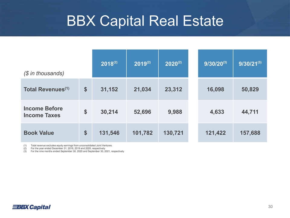 BBX Capital Real Estate (2) (2) (2) (3) (3) 2018 2019 2020 9/30/20 9/30/21 ($ in thousands) (1) Total Revenues $ 31,152 21,034 23,312 16,098 50,829 Income Before $ 30,214 52,696 9,988 4,633 44,711 Income Taxes Book Value $ 131,546 101,782 130,721 121,422 157,688 (1) Total revenue excludes equity earnings from unconsolidated Joint Ventures. (2) For the year ended December 31, 2018, 2019 and 2020, respectively (3) For the nine months ended September 30, 2020 and September 30, 2021, respectively 30