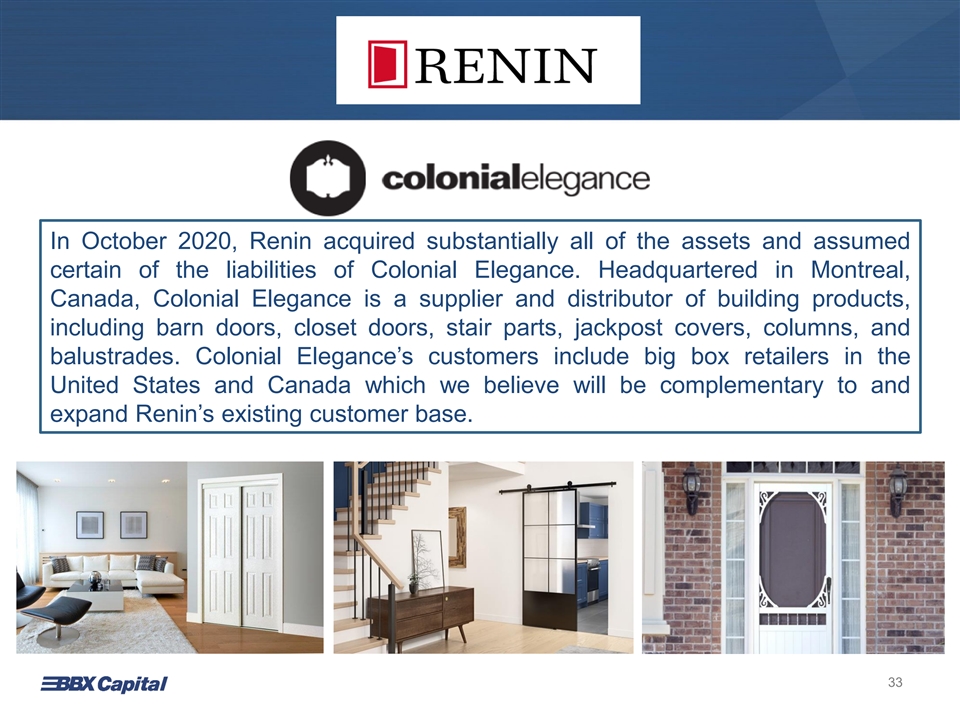 Renin is engaged in the design, manufacture, and distribution of sliding doors, door systems and hardware and home décor products. Renin, which is headquartered in Canada has three manufacturing and distribution facilities in the United States and Canada. In October 2020, Renin acquired Colonial Elegance, a supplier and distributor of building products, including barn doors, closet doors, and stair parts, primarily sold through various big box retailers in the United States and Canada. Renin had total assets of $107.2 million as of September 30, 2021. 32