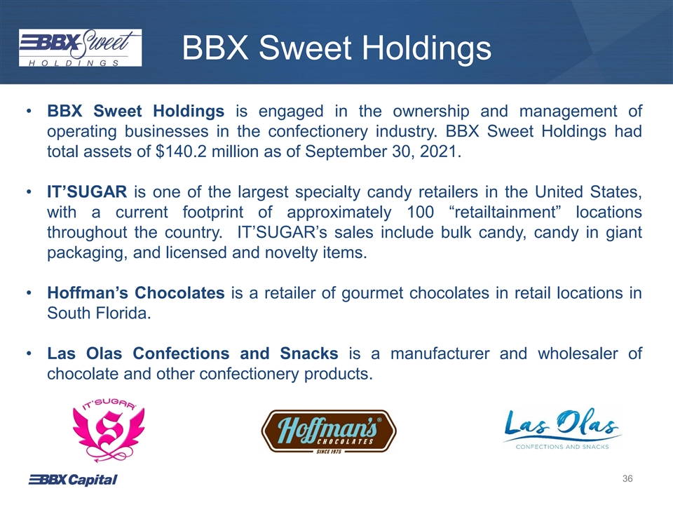 BBX Sweet Holdings • BBX Sweet Holdings is engaged in the ownership and management of operating businesses in the confectionery industry. BBX Sweet Holdings had total assets of $140.2 million as of September 30, 2021. •IT’SUGAR is one of the largest specialty candy retailers in the United States, with a current footprint of approximately 100 “retailtainment” locations throughout the country. IT’SUGAR’s sales include bulk candy, candy in giant packaging, and licensed and novelty items. •Hoffman’s Chocolates is a retailer of gourmet chocolates in retail locations in South Florida. • Las Olas Confections and Snacks is a manufacturer and wholesaler of chocolate and other confectionery products. 36