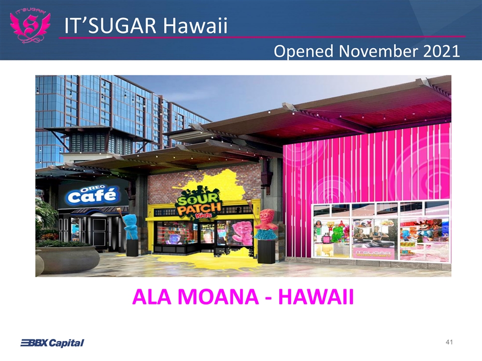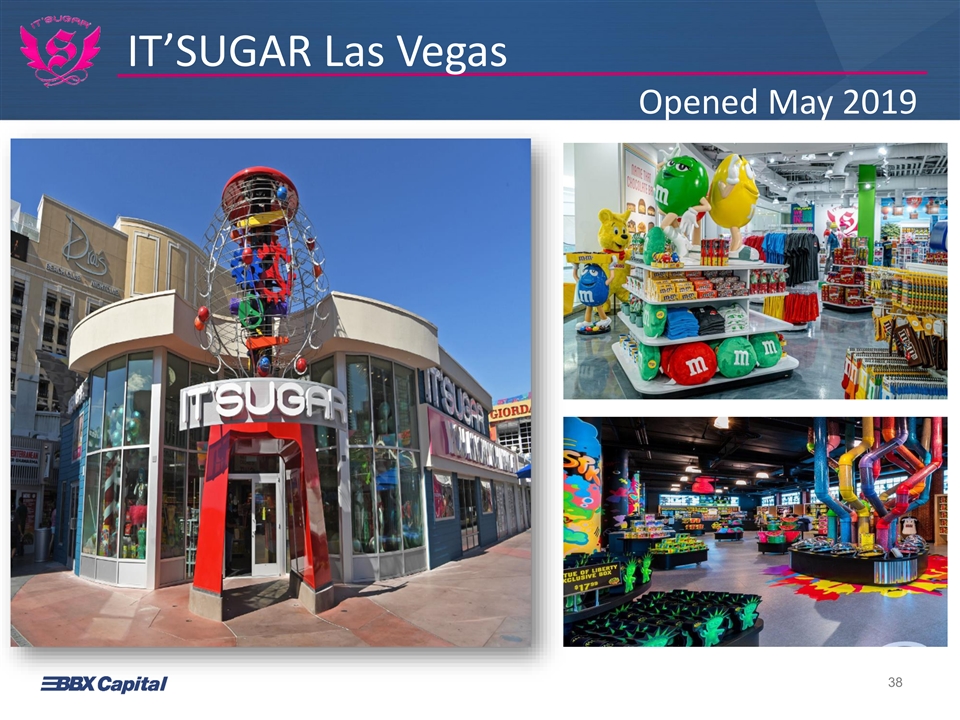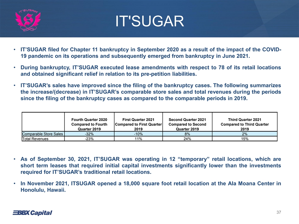 IT'SUGAR IT'SUGAR •IT’SUGAR filed for Chapter 11 bankruptcy in September 2020 as a result of the impact of the COVID- 19 pandemic on its operations and subsequently emerged from bankruptcy in June 2021. • During bankruptcy,IT’SUGAR executed lease amendments with respect to 78 of its retail locations and obtained significant relief in relation to its pre-petition liabilities. •IT’SUGAR’s sales have improved since the filing of the bankruptcy cases. The following summarizes the increase/(decrease) inIT’SUGAR’s comparable store sales and total revenues during the periods since the filing of the bankruptcy cases as compared to the comparable periods in 2019. Fourth Quarter 2020 First Quarter 2021 Second Quarter 2021 Third Quarter 2021 Compared to Fourth Compared to First Quarter Compared to Second Compared to Third Quarter Quarter 2019 2019 Quarter 2019 2019 Comparable Store Sales -32% -10% 8% 2% Total Revenues -23% 11% 24% 15% • As of September 30, 2021,IT’SUGAR was operating in 12“temporary” retail locations, which are short term leases that required initial capital investments significantly lower than the investments required forIT’SUGAR’s traditional retail locations. • In November 2021, ITSUGAR opened a 18,000 square foot retail location at the Ala Moana Center in Honolulu, Hawaii. 37