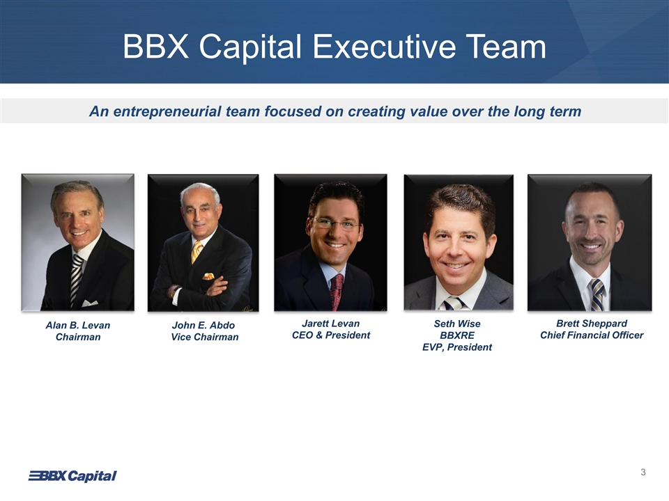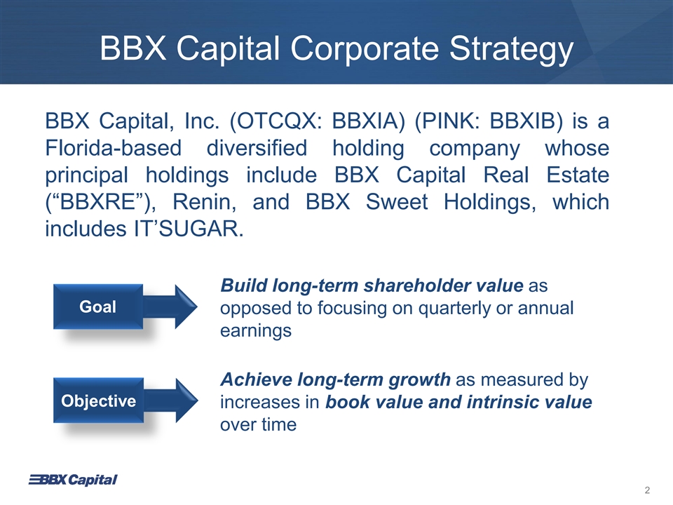 BBX Capital Corporate Strategy BBX Capital, Inc. (OTCQX: BBXIA) (PINK: BBXIB) is a Florida-based diversified holding company whose principal holdings include BBX Capital Real Estate (“BBXRE”), Renin, and BBX Sweet Holdings, which includes IT’SUGAR. Build long-term shareholder value as Goal opposed to focusing on quarterly or annual earnings Achieve long-term growth as measured by Objective increases in book value and intrinsic value over time 2