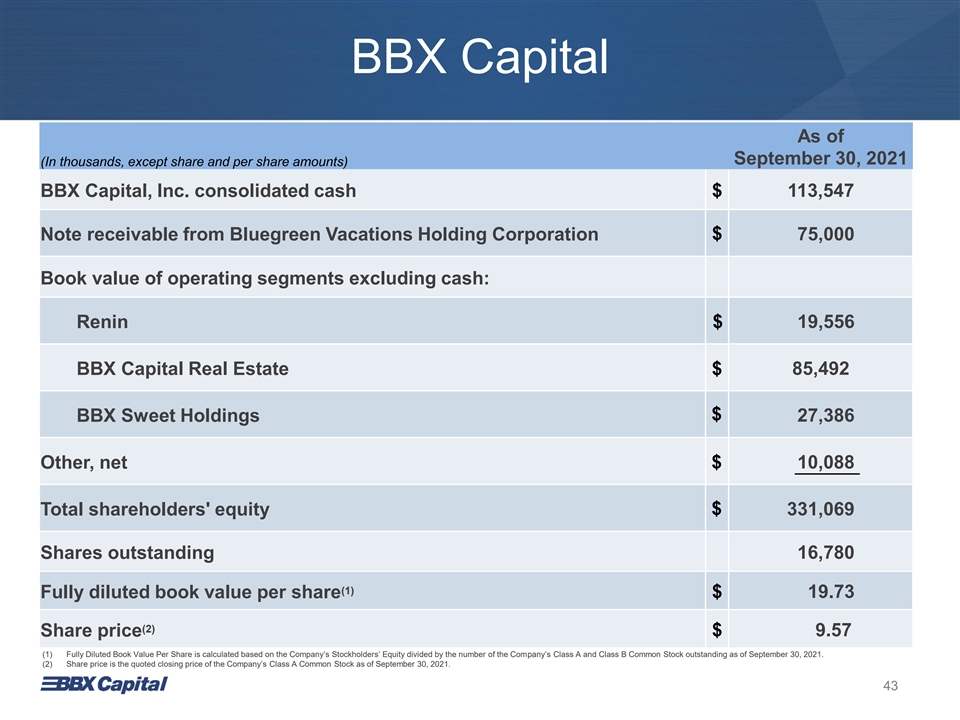 BBX Capital As of September 30, 2021 (In thousands, except share and per share amounts) BBX Capital, Inc. consolidated cash $ 113,547 $ 75,000 Note receivable from Bluegreen Vacations Holding Corporation Book value of operating segments excluding cash: Renin $ 19,556 BBX Capital Real Estate $ 85,492 $ 27,386 BBX Sweet Holdings Other, net $ 10,088 $ Total shareholders' equity 331,069 Shares outstanding 16,780 (1) Fully diluted book value per share $ 19.73 (2) $ 9.57 Share price (1) Fully Diluted Book Value Per Share is calculated based on the Company’s Stockholders’ Equity divided by the number of the Company’s Class A and Class B Common Stock outstanding as of September 30, 2021. (2) Share price is the quoted closing price of the Company’s Class A Common Stock as of September 30, 2021. 43