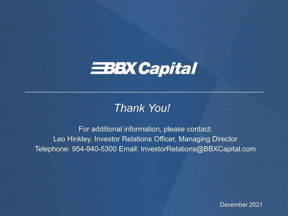 Thank You! For additional information, please contact: Leo Hinkley, Investor Relations Officer, Managing Director Telephone: 954-940-5300 Email: InvestorRelations@BBXCapital.com December 2021