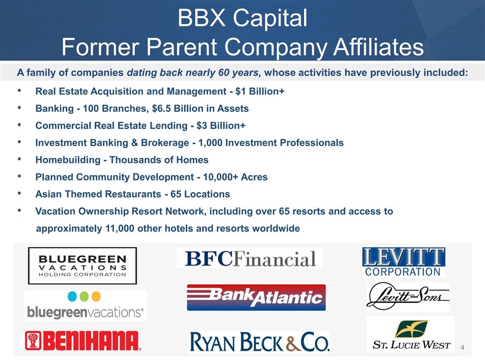BBX Capital Executive Team An entrepreneurial team focused on creating value over the long term Jarett Levan Brett Sheppard Seth Wise Alan B. Levan John E. Abdo CEO & President BBXRE Chief Financial Officer Chairman Vice Chairman EVP, President 3