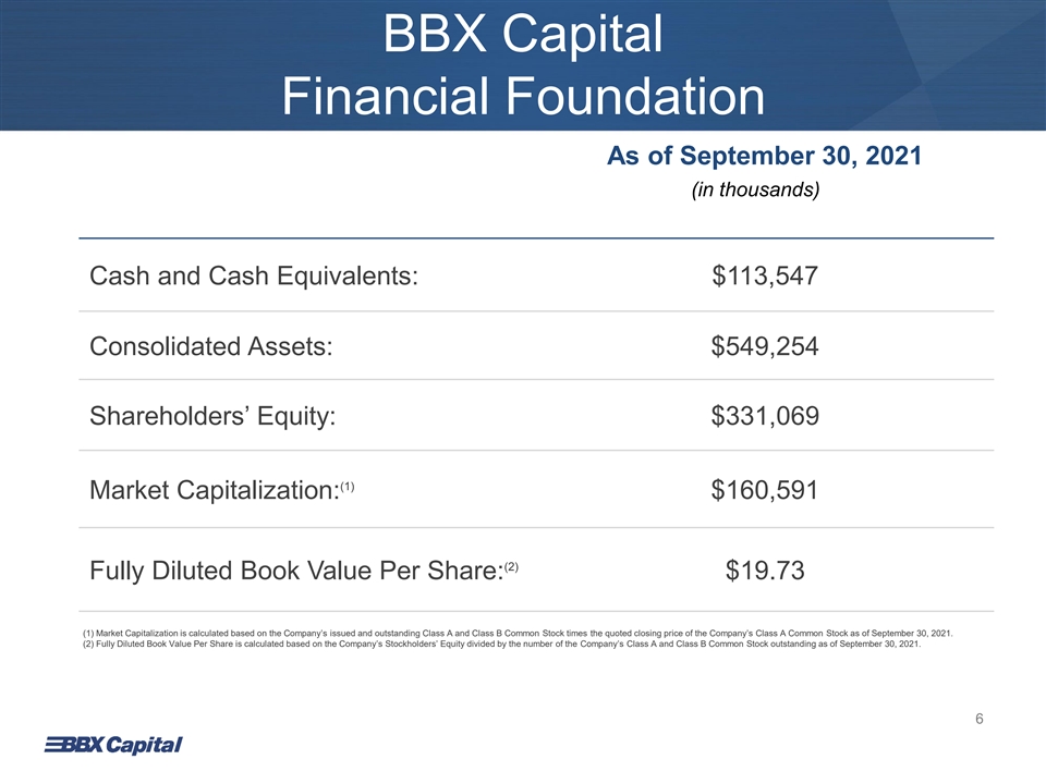 BBX Capital Financial Foundation (3)(4) (3)(4) (3)(4) (2)(4) (2) 2018 2019 2020 9/30/20 9/30/21 (In thousands) Total Revenues $ 208,565 203,724 173,229 116,990 215,384 (Loss) Income From Continuing $ (5,887) 20,651 (47,016) (43,580) 42,009 Operations Diluted (loss) Earnings Per Share $ (0.29) 1.08 (2.19) (2.01) 2.27 From Continuing Operations Fully Diluted Book $ 12.25 9.38 16.00 16.24 19.73 (1) Value Per Share (1) The numerator of Fully Diluted Book Value Per Share for all periods is Shareholders’ Equity. The denominator of Fully Diluted Book Value Per Share as of December 31, 2018, December 31, 2019, and September 30, 2020 is the shares of the Company’s Class A and Class B Common Stock issued in connection with the spin-off, while the denominator of Fully Diluted Book Value Per Share as of December 31, 2020 and September 30, 2021 is the actual number of shares of the Company’s Class A and Class B Common Stock outstanding as of the respective dates. (2) For the nine months ended September 30, 2020 and September 30, 2021, respectively. (3) For the year ended December 31, 2018, 2019 and 2020, respectively. (4) The Company was spun-off from Bluegreen Vacations Holding Corporation on September 30, 2020. The Company’s financial results prior to September 30, 2020 were derived from the accounting records of Bluegreen Vacations Holding Corporation (formerly known as BBX Capital Corporation) and include an allocation of expenses related to corporate overhead for the periods prior to the spin-off which were calculated and provided to the Company by its former holding company. 7
