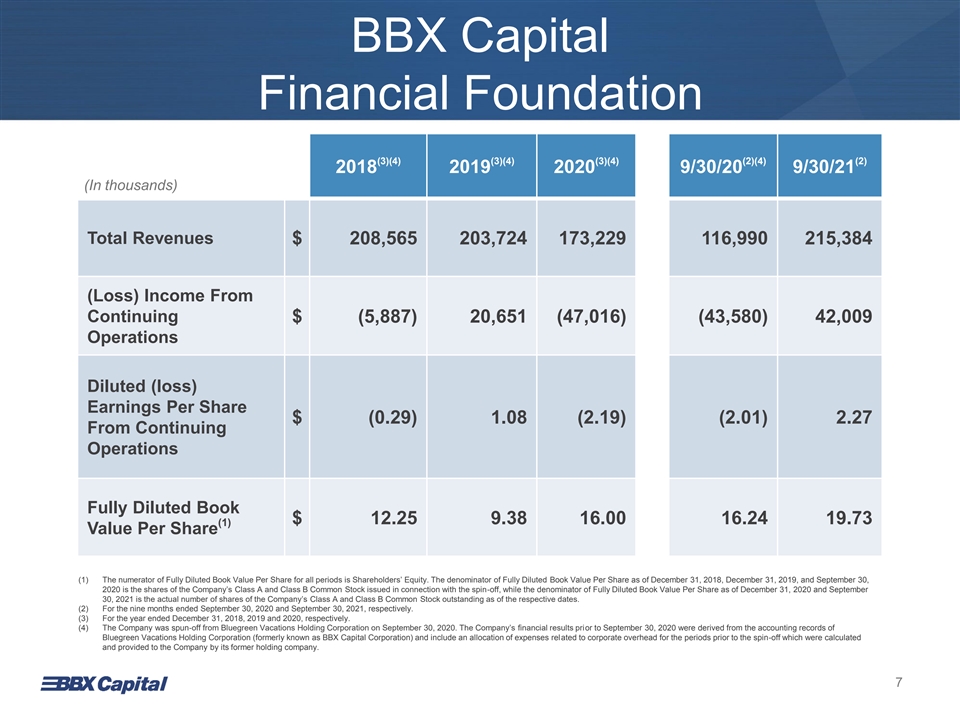 BBX Capital Financial Foundation As of September 30, 2021 (in thousands) Cash and Cash Equivalents: $113,547 Consolidated Assets: $549,254 Shareholders’ Equity: $331,069 (1) Market Capitalization: $160,591 (2) Fully Diluted Book Value Per Share: $19.73 (1) Market Capitalization is calculated based on the Company’s issued and outstanding Class A and Class B Common Stock times the quoted closing price of the Company’s Class A Common Stock as of September 30, 2021. (2) Fully Diluted Book Value Per Share is calculated based on the Company’s Stockholders’ Equity divided by the number of the Company’s Class A and Class B Common Stock outstanding as of September 30, 2021. 6